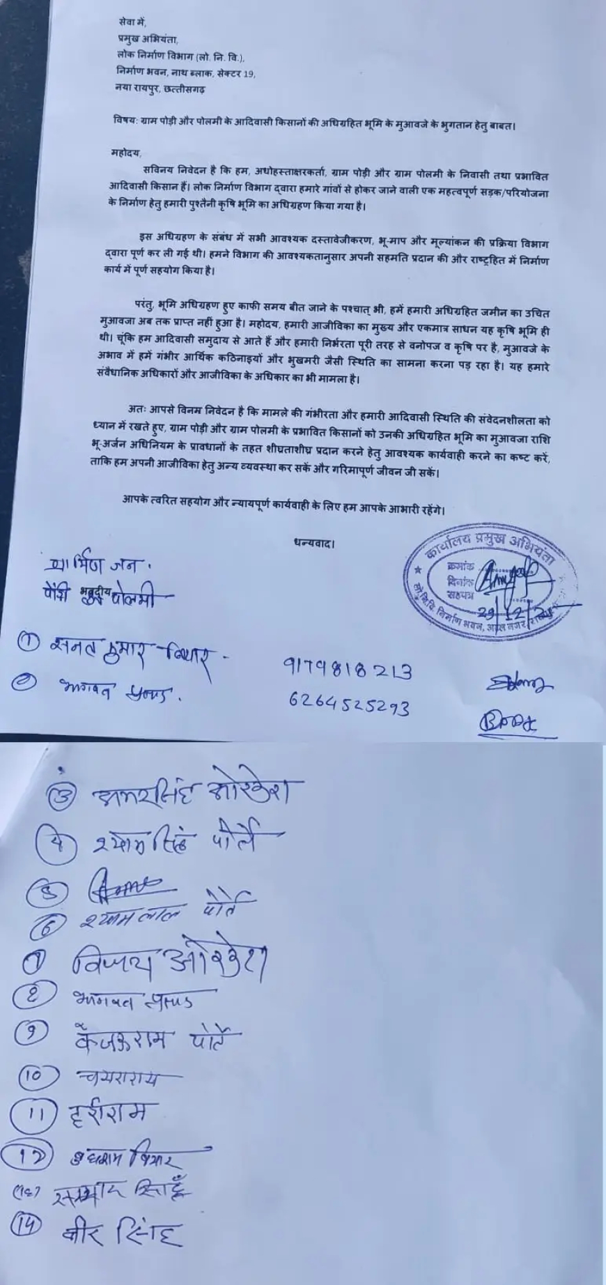 एडीबी योजना के तहत बनी सड़क निर्माण के लिए अधिग्रहित भूमि का मुआवजा पाने चार साल से भटक रहे पोड़ी और पोलमी के आदिवासी किसान...पूर्व विधायक के नेतृत्व में किसान पहुंचे रायपुर, प्रमुख अभियंता लोक निर्माण विभाग को सौंपा ज्ञापन