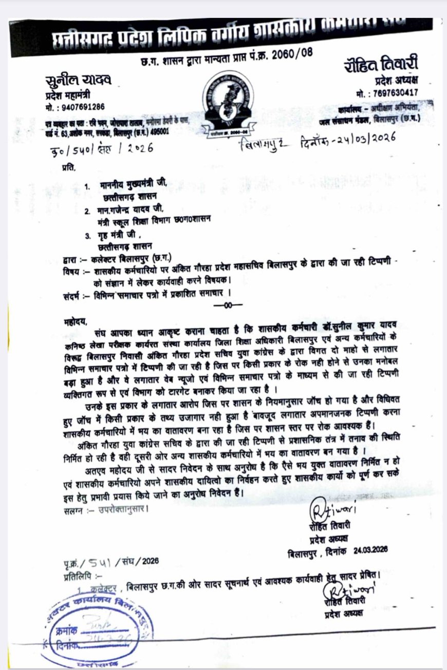 बिलासपुर में कर्मचारियों पर आरोपों की बौछार, संघ ने खोला मोर्चा...बिना सबूत कार्रवाई नहीं,कर्मचारी संगठनों का प्रशासन को साफ संदेश- रोहित तिवारी ...जांच में क्लीन चिट फिर भी दबाव,बिलासपुर में गरमाया मामला...कर्मचारी संगठनों का अल्टीमेटम- अब होगा आंदोलन