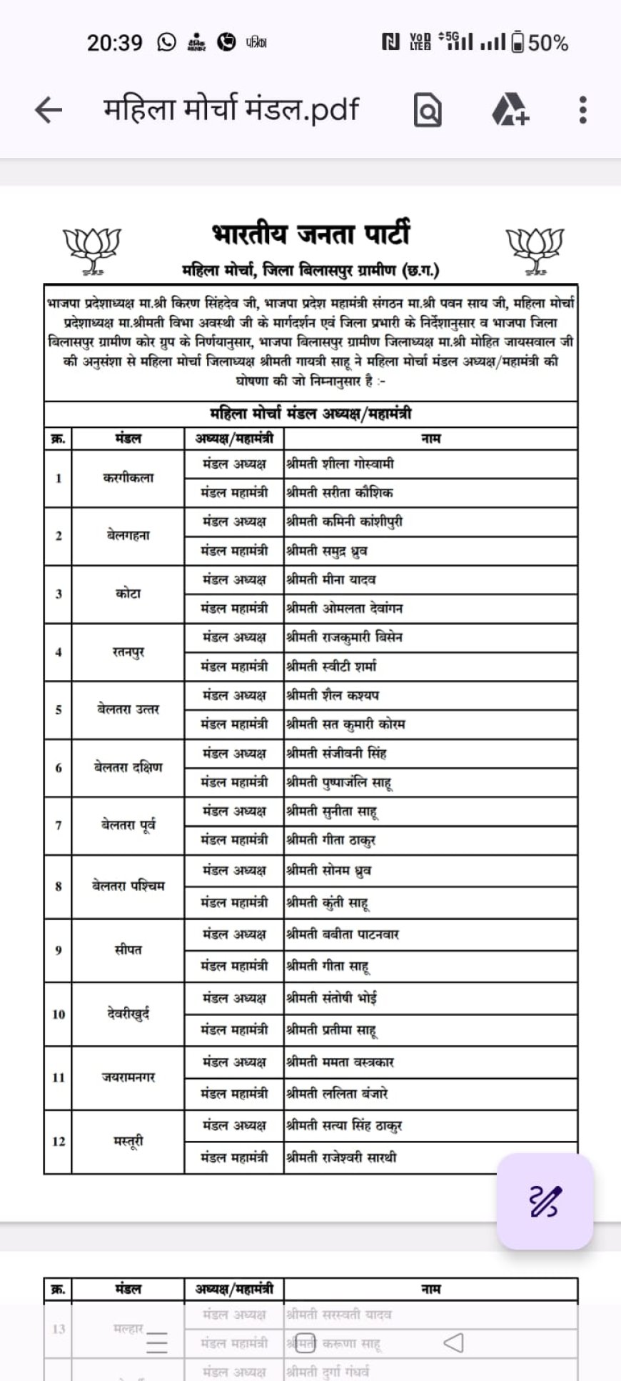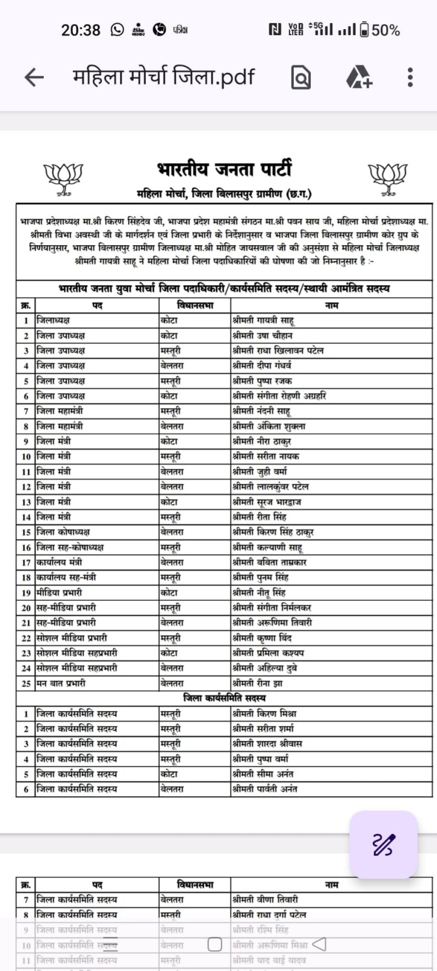 भाजपा बिलासपुर ग्रामीण में महिला मोर्चा की जिला व मंडल टीम घोषित