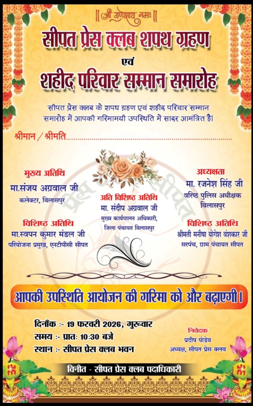 सतीश यादव सीपत। सीपत प्रेस क्लब द्वारा शपथ ग्रहण समारोह एवं शहीद परिवार सम्मान कार्यक्रम का आयोजन 19 फरवरी गुरुवार को प्रातः 10:30 बजे सीपत प्रेस क्लब भवन में किया जाएगा। कार्यक्रम को लेकर क्षेत्र में उत्साह का माहौल है। समारोह में मुख्य अतिथि के रूप में कलेक्टर बिलासपुर संजय अग्रवाल उपस्थित रहेंगे। कार्यक्रम की अध्यक्षता वरिष्ठ पुलिस अधीक्षक बिलासपुर रजनेश सिंह जी करेंगे। अति विशिष्ट अतिथि के रूप में जिला पंचायत बिलासपुर के मुख्य कार्यपालन अधिकारी संदीप अग्रवाल जी शामिल होंगे। विशिष्ट अतिथियों में एनटीपीसी सीपत के परियोजना प्रमुख स्वपन कुमार मंडल तथा ग्राम पंचायत सीपत की सरपंच मनीषा योगेश बंजारे की गरिमामयी उपस्थिति रहेगी।कार्यक्रम में सीपत प्रेस क्लब के नवनिर्वाचित पदाधिकारियों को शपथ दिलाई जाएगी तथा क्षेत्र के शहीद परिवारों को सम्मानित किया जाएगा। आयोजकों का कहना है कि शहीद परिवारों का सम्मान समाज का नैतिक दायित्व है और इस आयोजन के माध्यम से उनके प्रति कृतज्ञता व्यक्त की जाएगी।सीपत प्रेस क्लब के अध्यक्ष प्रदीप पांडेय ने क्षेत्रवासियों से कार्यक्रम में अधिक से अधिक संख्या में उपस्थित होकर आयोजन की गरिमा बढ़ाने की अपील की है।