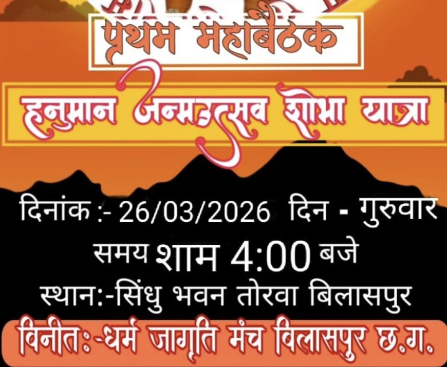 बिलासपुर। आगामी हनुमान जन्मोत्सव को लेकर धर्म जागृति मंच द्वारा तैयारियां तेज कर दी गई हैं। इसी क्रम में तोरवा स्थित सिंधु भवन में प्रथम बैठक आयोजित की गई, जिसमें शहर के विभिन्न सामाजिक, धार्मिक और व्यापारी वर्ग के प्रतिनिधियों ने भाग लिया। बैठक में इस वर्ष आयोजन को भव्य और ऐतिहासिक बनाने के लिए विस्तृत रणनीति तैयार की गई। मंच के पदाधिकारियों ने बताया कि 2 अप्रैल 2026 को मनाए जाने वाले हनुमान जन्मोत्सव के अवसर पर पूरे शहर में विशेष कार्यक्रम आयोजित किए जाएंगे। इसके तहत भव्य शोभा यात्रा निकाली जाएगी, जिसमें बड़ी संख्या में श्रद्धालुओं की भागीदारी सुनिश्चित की जाएगी। आयोजन को लेकर शहर में अभी से उत्साह का माहौल है। विभिन्न सामाजिक संगठनों की सक्रियता से न केवल धार्मिक वातावरण बना हुआ है, बल्कि सियासी और सामाजिक हलचल भी तेज हो गई है। तैयारियों को अंतिम रूप देने के लिए 29 मार्च 2026 को हरदेवलाल मंदिर में द्वितीय महापैठक आयोजित की जाएगी। धर्म जागृति मंच ने शहरवासियों से अपील की है कि वे अधिक से अधिक संख्या में शामिल होकर आयोजन को सफल और ऐतिहासिक बनाएं।