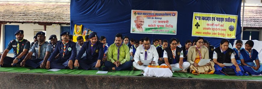 बिलासपुर - भारत स्काउट्स एवं गाइड्स, छत्तीसगढ़ के राज्यमुख्य आयुक्त इंद्रजीत सिंह खालसा एवं राज्य सचिव जितेन्द्र कुमार साहू के निर्देशानुसार तथा जिला मुख्य आयुक्त चंद्रप्रकाश बाजपेयी, जिला शिक्षा अधिकारी विजय टांडे एवं सहायक राज्य आयुक्त (स्काउट) विजय कुमार यादव के मार्गदर्शन में जिले में राष्ट्रपिता महात्मा गांधी जी की पुण्यतिथि पर श्रद्धांजलि कार्यक्रम का आयोजन किया गया। इस अवसर पर गांधी चौक, बिलासपुर स्थित महात्मा गांधी जी की प्रतिमा पर माल्यार्पण कर उनके बलिदान को स्मरण किया गया। तत्पश्चात सेजेस महारानी लक्ष्मी बाई विद्यालय में गांधी जी की स्मृति में “सर्वधर्म प्रार्थना सभा” का आयोजन किया गया, जिसमें जिले के 200 से अधिक स्काउट्स, गाइड्स, रोवर्स, रेंजर्स, स्काउटर एवं गाइडर उपस्थित रहे। कार्यक्रम को संबोधित करते हुए जिला मुख्य आयुक्त चंद्रप्रकाश बाजपेयी ने कहा कि महात्मा गांधी भारत के स्वतंत्रता संग्राम के सबसे प्रभावशाली नेताओं में से एक थे। उनका पूरा नाम मोहनदास करमचंद गांधी था। सत्य एवं अहिंसा के सिद्धांतों पर आधारित उनके आंदोलन ने भारत को स्वतंत्रता दिलाने में महत्वपूर्ण भूमिका निभाई। उन्हें ससम्मान “राष्ट्रपिता”, “बापू” एवं “महात्मा” कहा जाता है। कार्यक्रम में मुख्य अतिथि के रूप में जिला मुख्य आयुक्त चंद्रप्रकाश बाजपेयी उपस्थित रहे एवं कार्यक्रम की अध्यक्षता सहायक राज्य आयुक्त (स्काउट) विजय कुमार यादव ने की। इस अवसर पर सेजेस महारानी लक्ष्मी बाई विद्यालय की प्राचार्य डॉ. प्रज्ञा गोपाल, जिला सचिव लता यादव, जिला संगठन आयुक्त (स्काउट) महेन्द्र बाबू टंडन, जिला प्रशिक्षण आयुक्त (स्काउट) संतोष त्रिपाठी सहित शत्रुघ्न सूर्यवंशी, अनिल सोनवानी, उदय नारायण जगत, रुद्र सोनी, सी.एस. पैकरा, गाइडर किरण बाला पाण्डेय, रागिनी चौधरी, रश्मि तिवारी, भारती दुबे, रत्ना दास, पार्वती कौशिक, अपर्णा सारखेल, कल्पना सिंह, लक्ष्मी बृजवासी, सुयश दुबे, डॉ. शीला शर्मा, निशि कश्यप, देवकिरण साहू, चेतना सिंह ठाकुर, कौशल्या साहू सहित जिले के अनेक स्काउट, गाइड, रोवर्स, रेंजर्स, स्काउटर एवं गाइडर उपस्थित रहे। कार्यक्रम का समापन राष्ट्रपिता महात्मा गांधी जी के विचारों को अपने जीवन में आत्मसात करने के संकल्प के साथ किया गया।